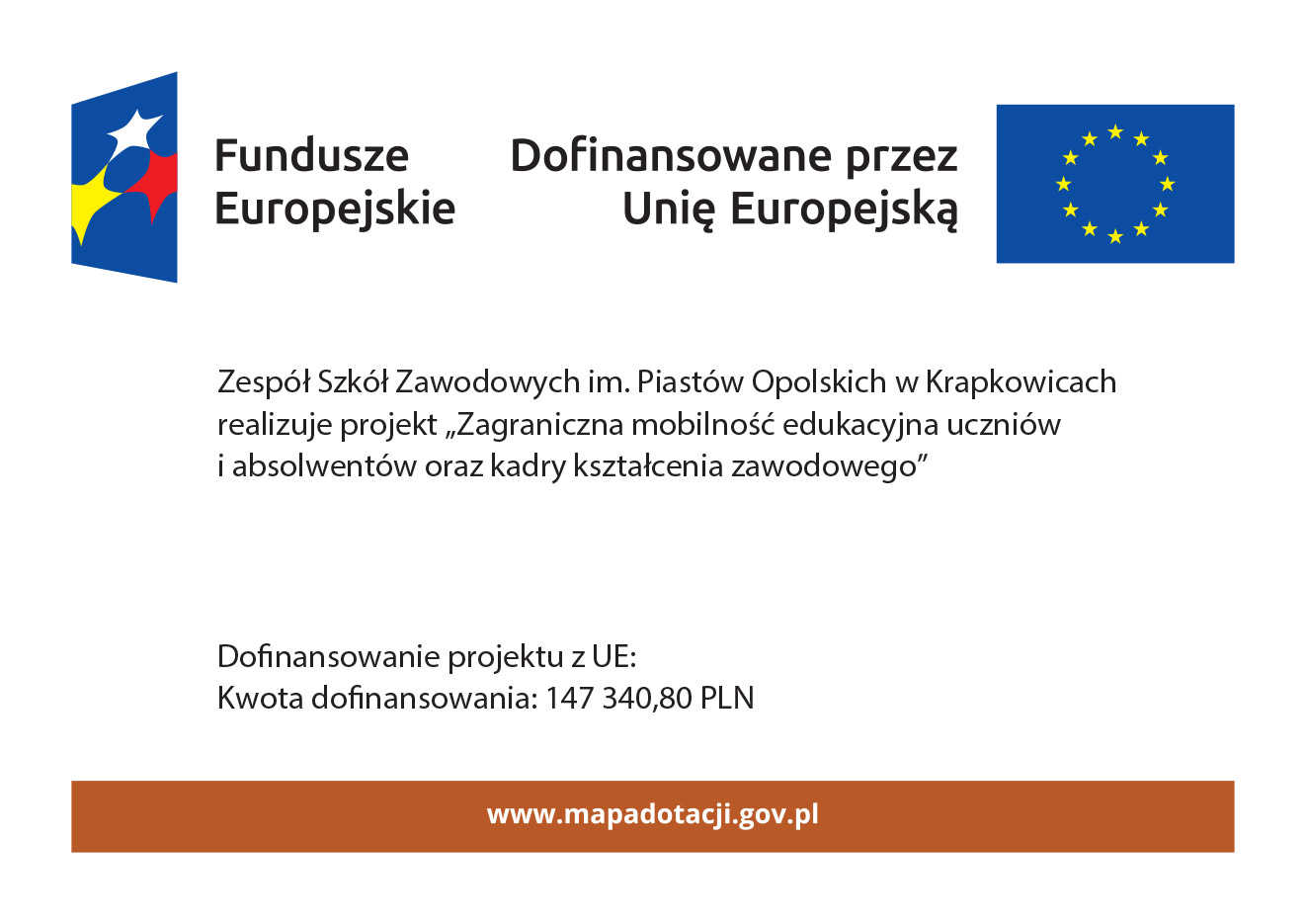 Miło nam poinformować, że Fundacja Rozwoju Systemu Edukacji zatwierdziła nasz wniosek Akcji 1 sektora Kształcenie i szkolenia zawodowe i otrzymaliśmy dofinansowanie z projektu Zagraniczna mobilność edukacyjna uczniów i absolwentów oraz kadry kształcenia zawodowego na realizację naszego działania: Praktyki zagraniczne pierwszym krokiem do sukcesu zawodowego. W ramach programu Fundusze Europejskie dla Rozwoju Społecznego 2021-2027 nasza młodzież będzie mogła odbyć wraz z innymi rówieśnikami innych krajów zagraniczne praktyki zawodowe. O dalszych działaniach będziemy Państwa informować na bieżąco.