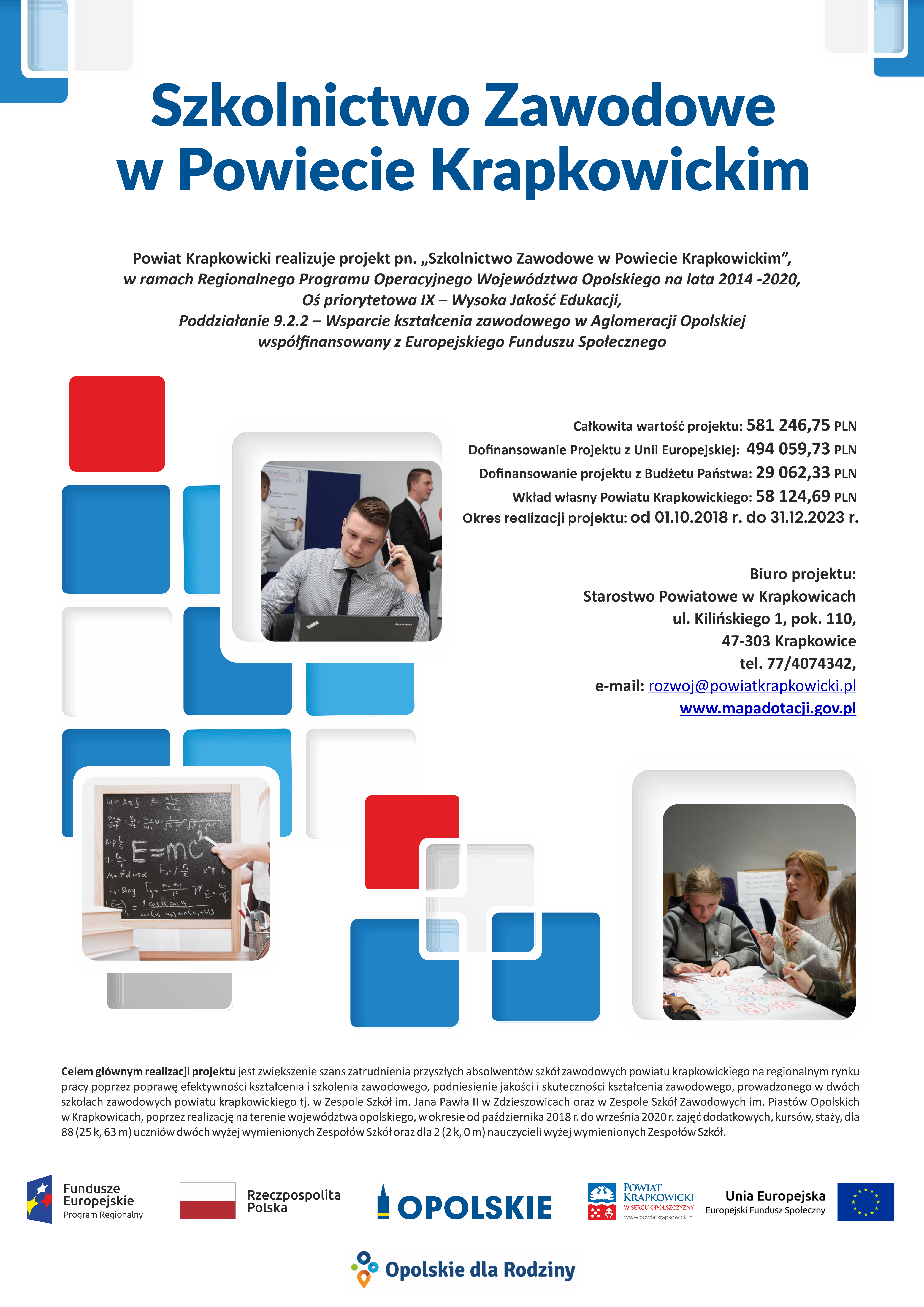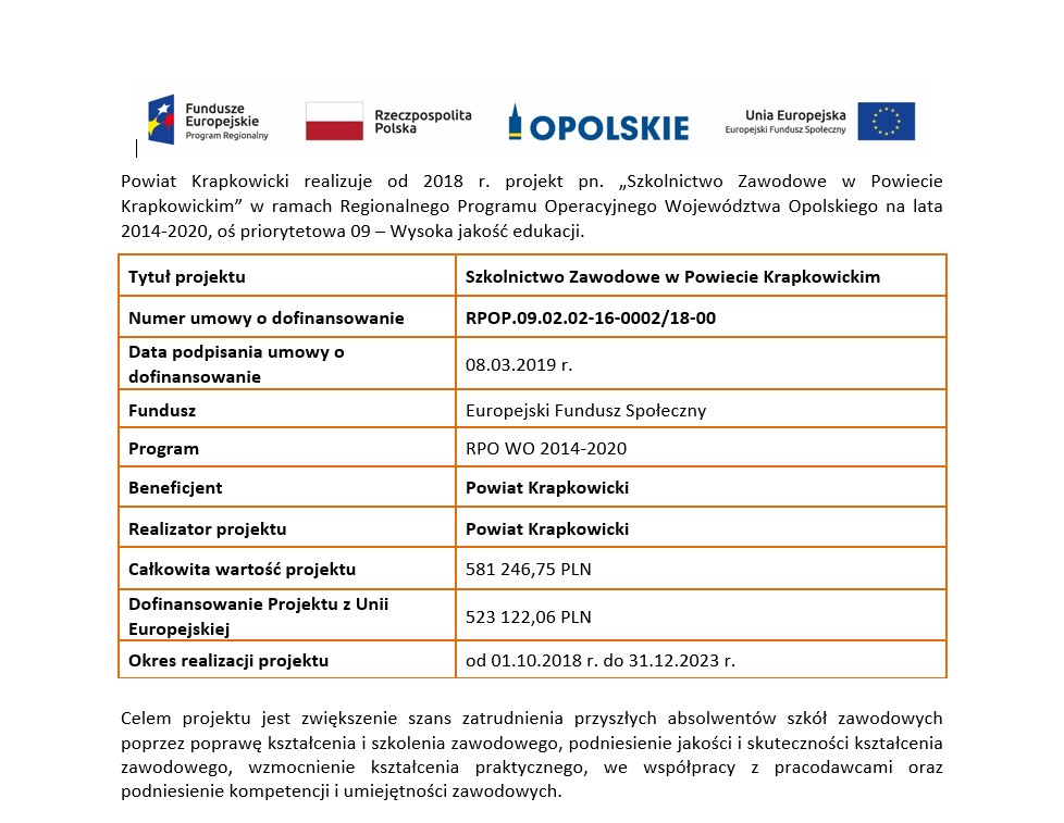 Projekt „Szkolnictwo Zawodowe w Powiecie Krapkowickim” realizowany w ramach Regionalnego Programu Operacyjnego Województwa Opolskiego na lata 2014 – 2020, Oś priorytetowa IX – Wysoka Jakość Edukacji, Poddziałanie 9.2.2 – Wsparcie kształcenia zawodowego w Aglomeracji Opolskiej współfinansowany z Europejskiego Funduszu Społecznego.